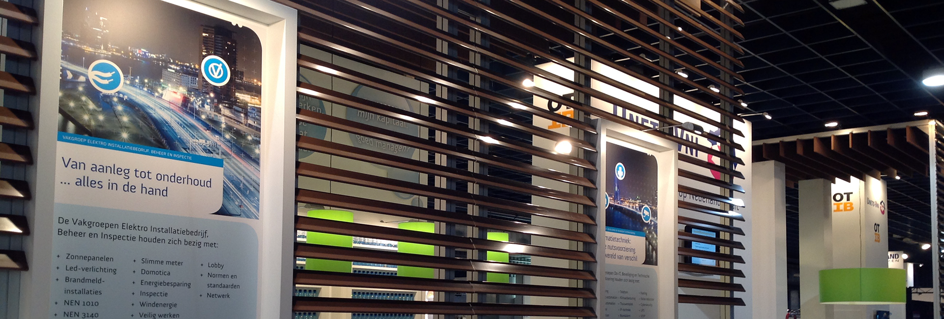 Van full-colours, freeswerk tot vinyl logo’s en teksten op diverse standwanden en displays.