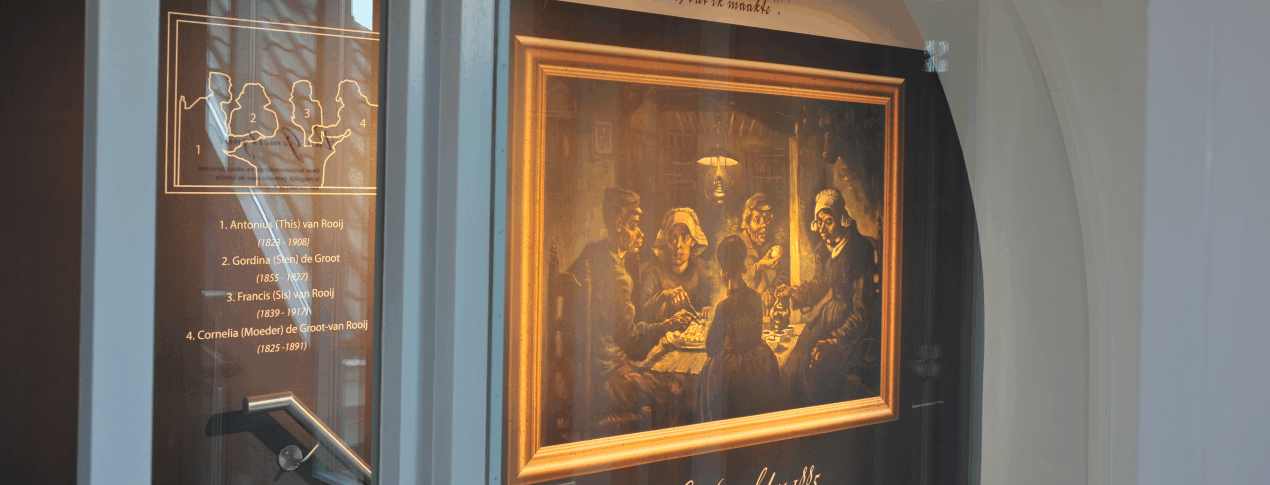 Wij hebben de nodige retouche werkzaamheden moeten verrichten om het digitaal bestand van het schilderij De Aardappeleters geschikt te maken voor de gewenste uitvergroting van 200 x 142 cm. De totale wallpaper had een oppervlakte van 350 x 550 cm. De informatie voor de legenda is aangeleverd door Vincentre.